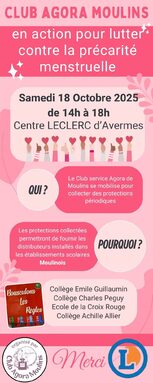 Samedi 18 octobre: collecte de protections menstruelles par le club AGORA de Moulins à Leclerc Avermes de 14h00 à 18h00.